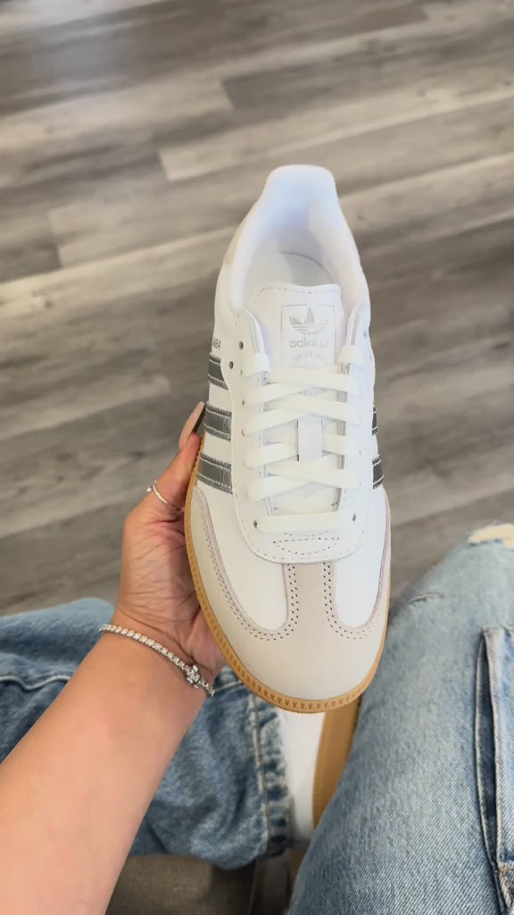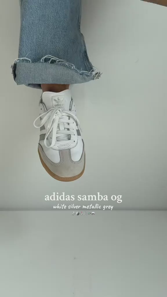 The Samba OG "Metallic White" delivers a refined update to the classic silhouette, pairing a crisp white upper with striking metallic silver side stripes. A neutral suede toe overlay and gum sole preserve its heritage feel, while the understated shimmer adds a modern, elevated touch. Perfect for versatile styling, from casual streetwear to smart-casual outfits.