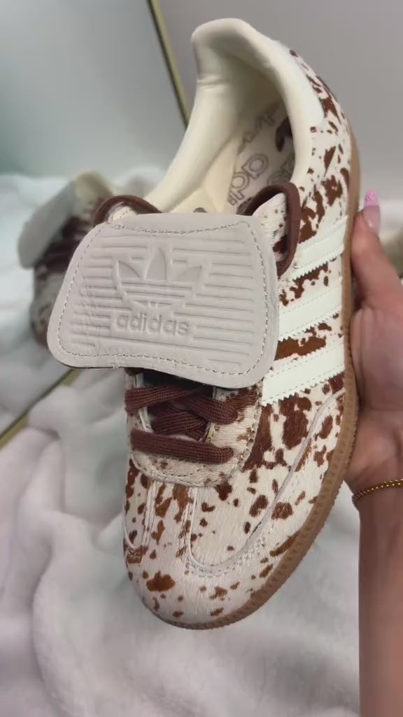 The Samba OG "Cow Brown Print" introduces a playful twist to the heritage silhouette, featuring a white base with striking brown cow-print patterns across the upper. Cream stripes and heel tab add balance, while the gum sole maintains the retro Samba identity. Finished with a lace-and-strap closure system, this edition blends functionality with unique flair.